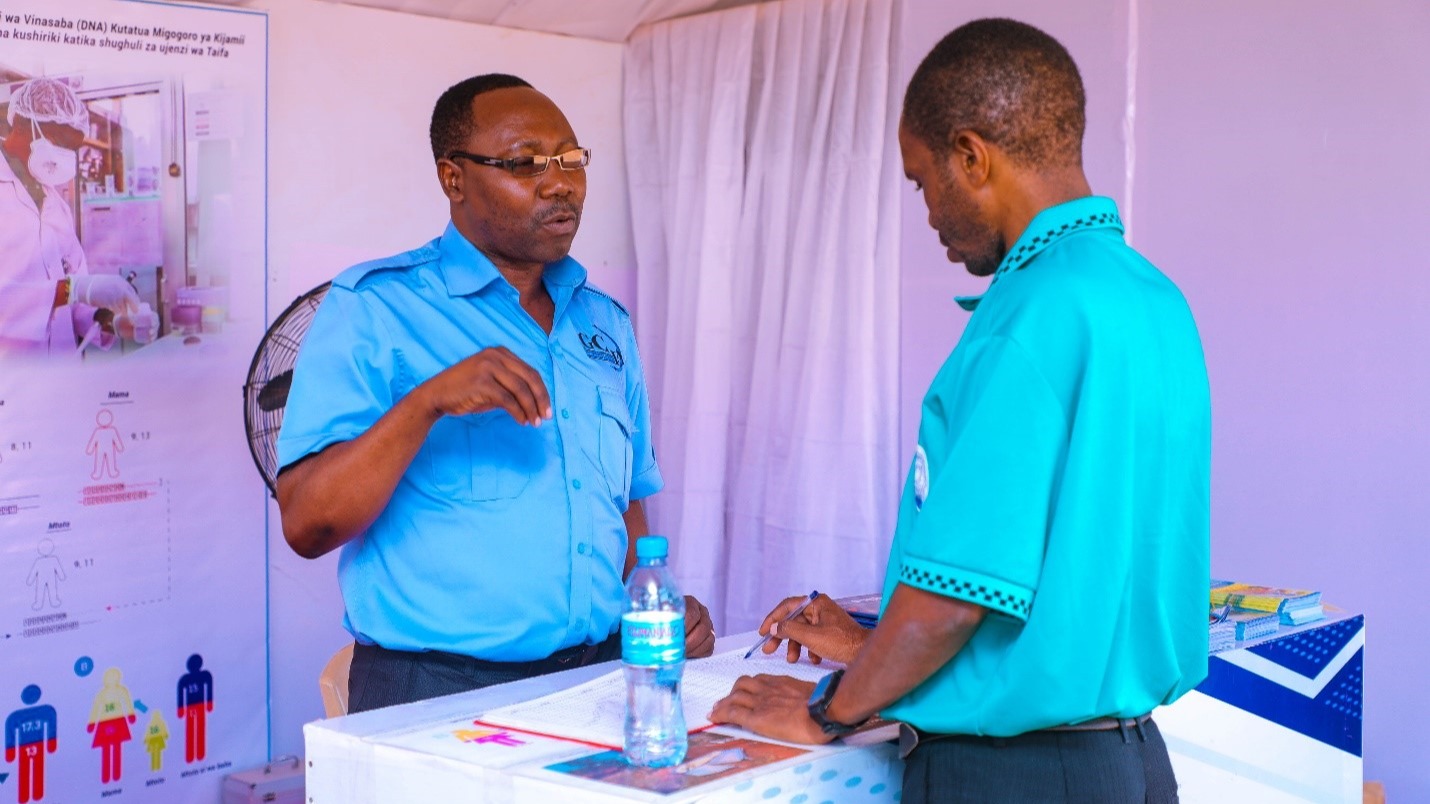 Meneja wa Usajili na Ukaguzi wa Maabara za Sayansi Jinai na Vinasaba vya Binadamu, Fidelis Segumba (kushoto), akimsikili...
