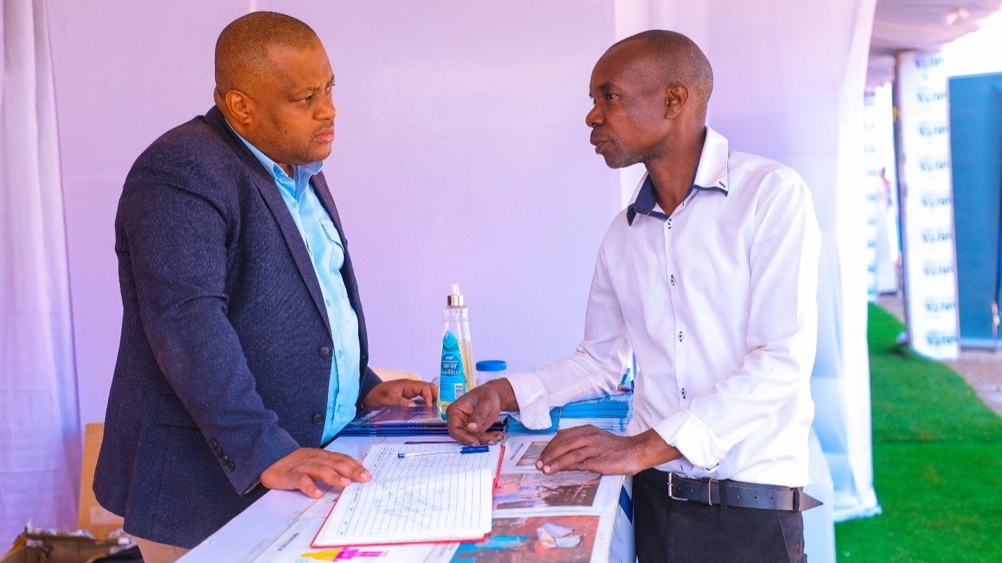 Meneja wa Mamlaka, Ofisi ya Kanda ya Ziwa, John Wanjala (kushoto), akitoa elimu kwa mwananchi aliyetembelea banda la Mam...